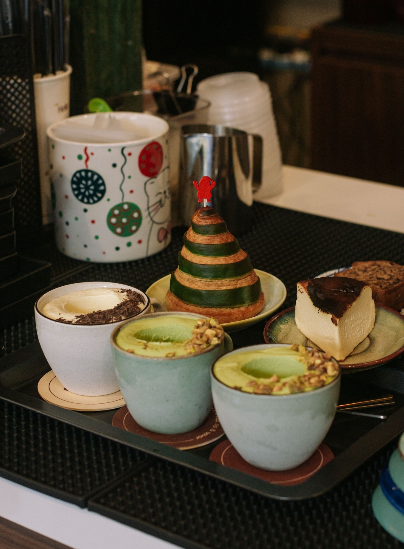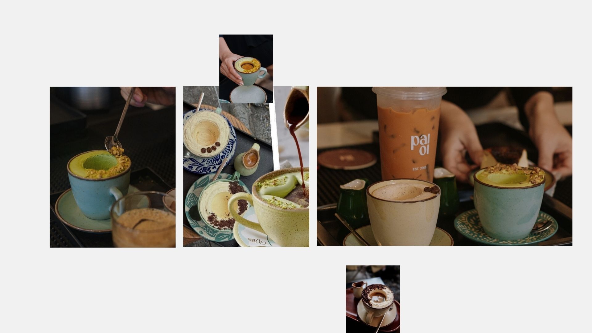 지엡: 이 카페는 평범한 유리잔이나 머그컵 대신, 일부러 데커레이션에 신경을 많이 썼습니다. 가운데가 깊게 파인 큰 잔에 아이스크림을 담아서 마치 작은 그릇처럼 보이게 하고, 그 위에는 초콜릿 조각이나 커피 원두, 얇은 초콜릿 코팅 등을 얹어 섬세하게 장식하죠. 이렇게 ‘비주얼’을 최대한 살려서, 예쁜 사진을 찍어 SNS에 올리고 싶어 하는 손님들의 마음을 정확하게 공략하고 있습니다.