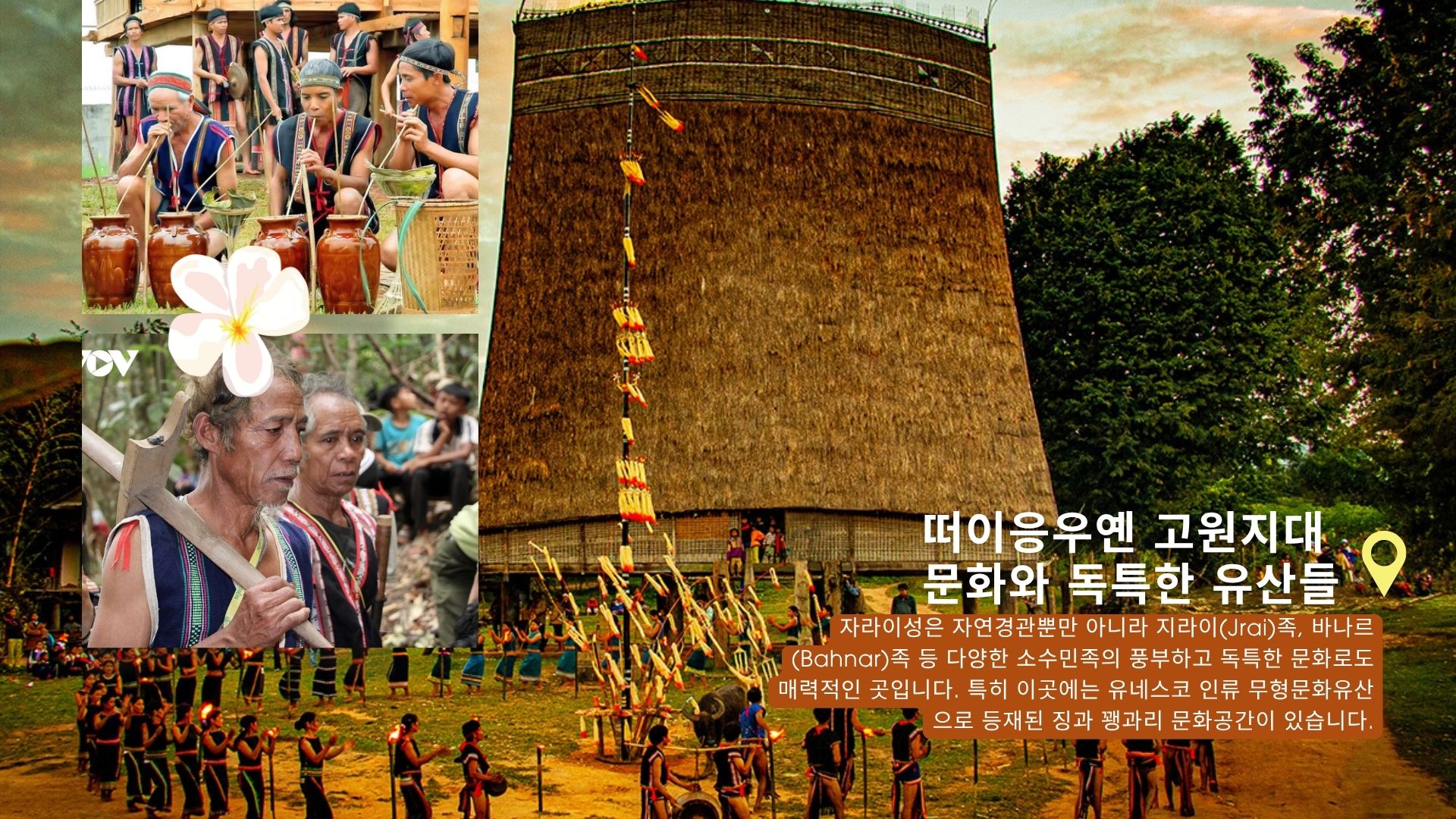 경민: 청취자 여러분, 자라이성은 자연경관뿐만 아니라 지라이(Jrai)족, 바나르(Bahnar)족 등 다양한 소수민족의 풍부하고 독특한 문화로도 매력적인 곳입니다. 특히 이곳에는 유네스코 인류 무형문화유산으로 등재된 징과 꽹과리 문화공간이 있습니다.