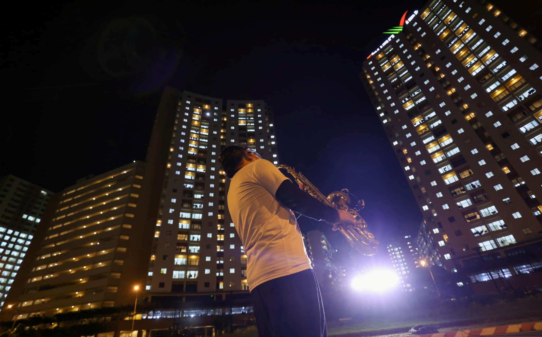 B: Leading jazz artist Trần Mạnh Tuấn recently gave an unusual performance in HCM City playing his saxophone for thousands of COVID-19 patients and frontline workers at field hospitals.