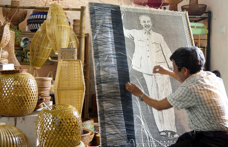 A: Many Phu Vinh bamboo and rattan products are made of extremely thin strips woven with a small awl as if embroidered and fashioned into fruit baskets, trays, plates, bags, suitcases, sandals, hats, lamp shades, and flower vases. Even portraits and landscape paintings can be recreated in bamboo and rattan.