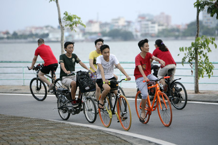B: Much like in Western countries, many Vietnamese enjoy cycling as a sport or as a healthy way to commute. In the early morning, a large number of people ride bicycles around the lakes in Hanoi to enjoy the fresh air and deserted streets before peak traffic hours when people go to work. West Lake, the largest of Hanoi's lakes, with a shoreline 17 kilometres long, is the most popular trail for riders.