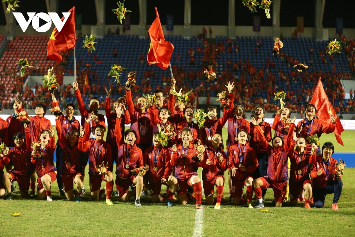Vietnam women's football team celebrates their victory at SEA Games 32. (photo: VOV)