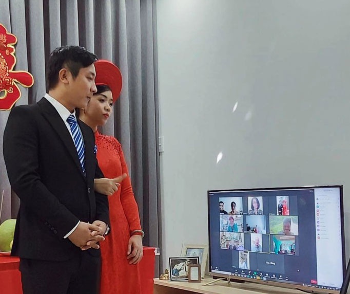 A: Despite having a virtual ceremony, couples retain traditional marriage procedures like preparing betel leaves, areca nuts, wines, fruits, cakes, and tea for their ancestors and for the wedding ceremony. A master of ceremonies conducts the ceremony with the couple wearing their wedding costumes. At the moment the couple exchange wedding rings, everyone raises a glass to toast them via the computer screen.