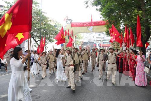 B: A highlight was a music and dance performance involving 200 members of a military band, musicians from the Vietnam National Academy of Music, and actors and students from the Hanoi Academy of Theatre and Cinema. They recreated the scene of the liberation army arriving in Hanoi, with citizens waving flags and flowers to welcome the soldiers back from battle.