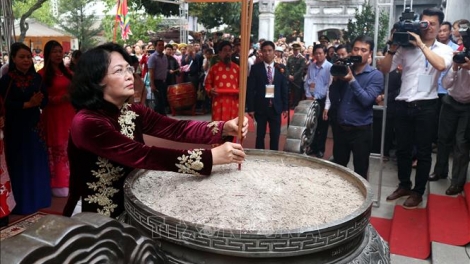 (VOVWORLD) - ທ່ານນາງຮອງປະທານປະເທດ ຫວຽດນາມ ດັ້ງທິງອັກທິ້ງ ໄດ້ປະຕິບັດພິທີຕີກອງໄຂງານບຸນ, ຖະຫວາຍທູບທຽນ, ອາໄລຫາການລຸກຮື້ຂຶ້ນຂອງສອງພະນາງຈຶງ