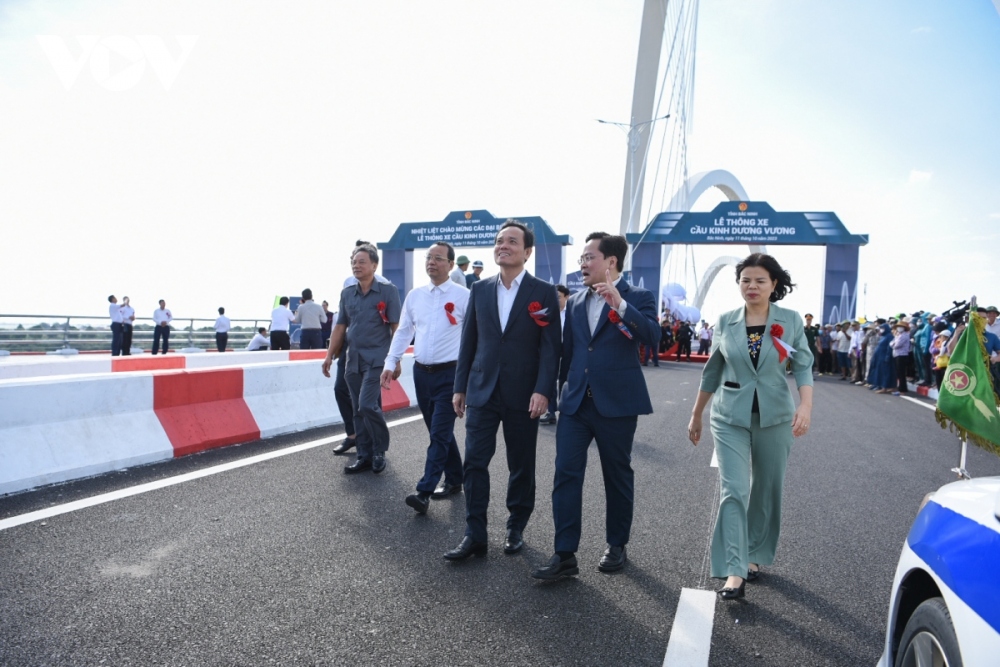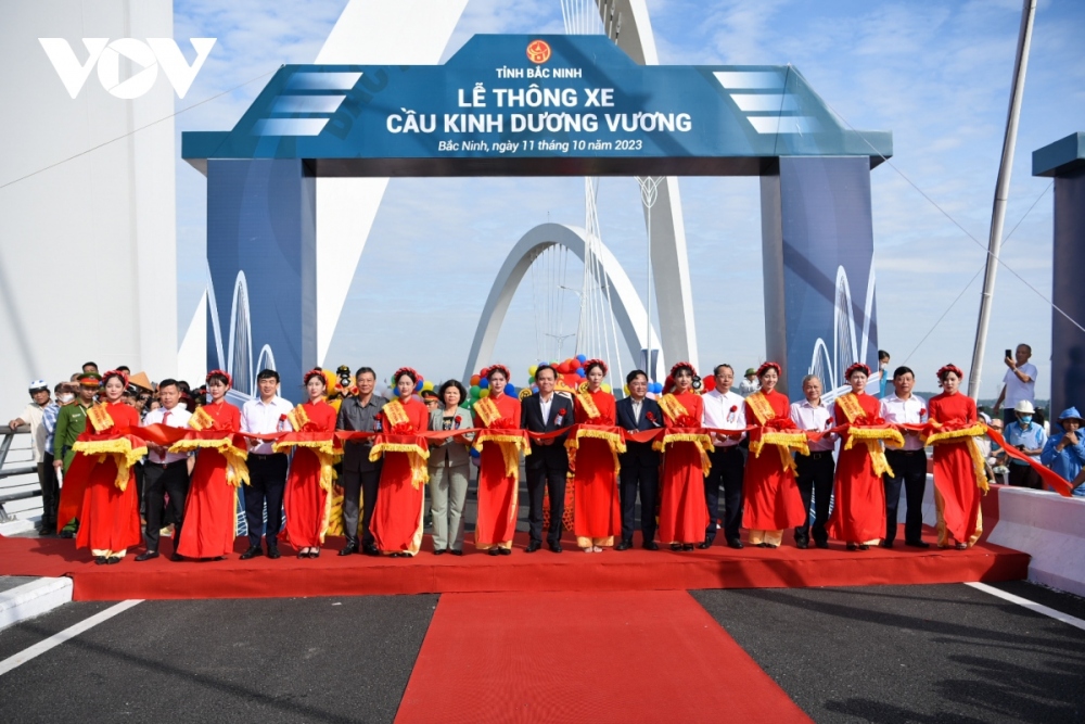 Deputy Prime Minister Tran Luu Quang (C) and the administration of Bac Ninh participate in the inauguration ceremony of Kinh Duong Vuong bridge.