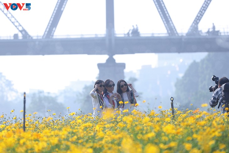 The area beneath the historic Long Bien bridge is now a garden full of blooming flowers, attracting hundreds of visitors everyday. |