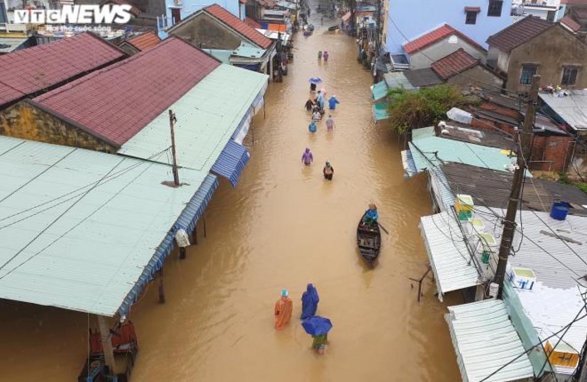 Situated by the Hoai River, Bach Dang street is left hidden under floodwater as high as one metre. |