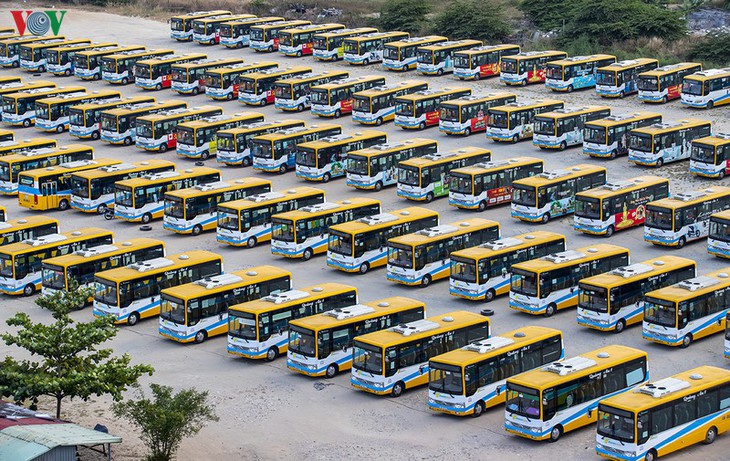 Buses gather at a parking lot as bus services have temporarily been halted. |
