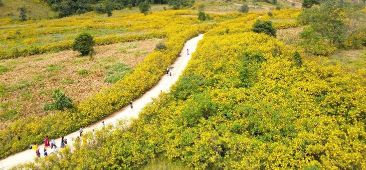 Vivid carpets of wild sunflowers blanket the hillsides and trails surrounding the millions-year-old volcano.(Photo: tienphong.vn) |