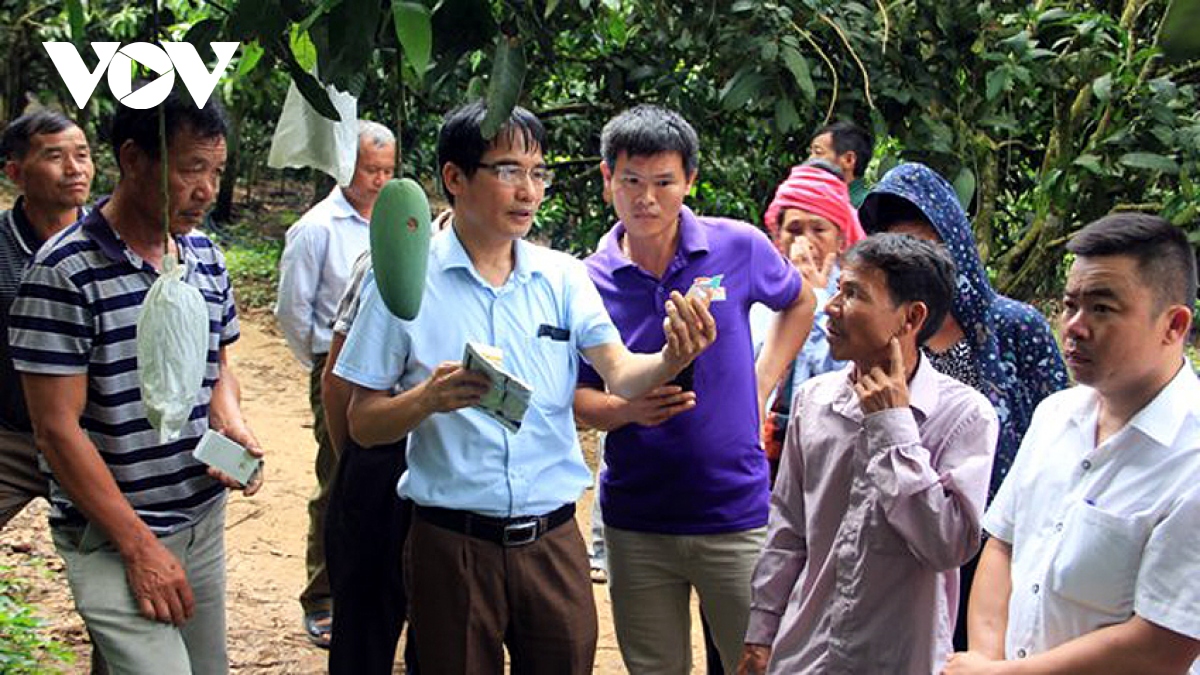Dr. Vu Quang Giang instructs local farmers in Son La province on how to prevent mango fruit borers. (Photo: VOV) |