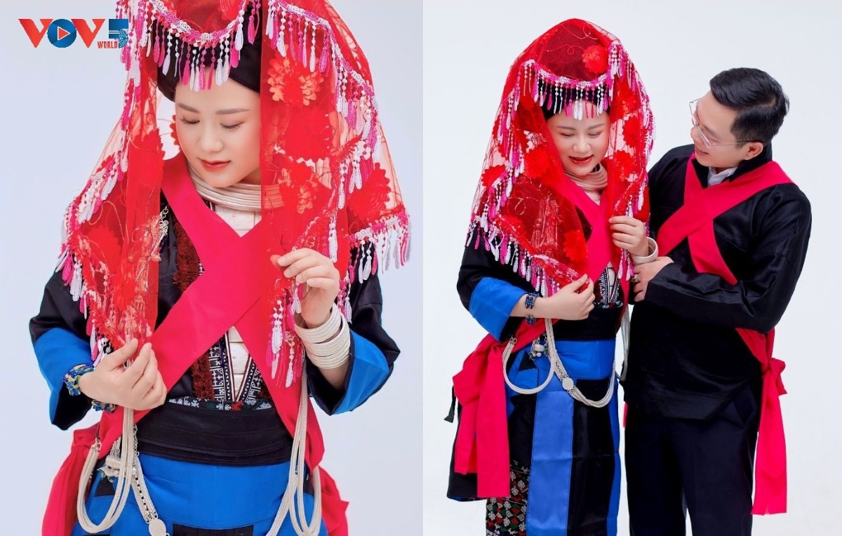 The wedding attires of Dao Khau brides and grooms are modernized to be both beautiful and practical. The bride's veil is redesigned in a vibrant red, adding to its brilliance. (Photo: Cheo Thu/VOV) |