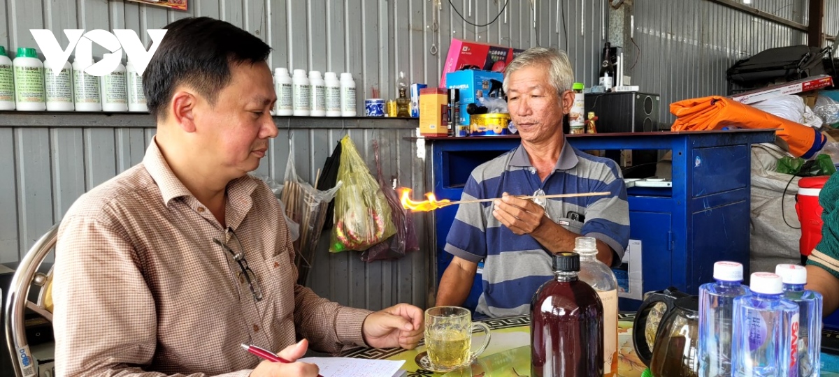 Vo Hoai Phong burns refined materials made from plastic waste. (Photo: VOV) |