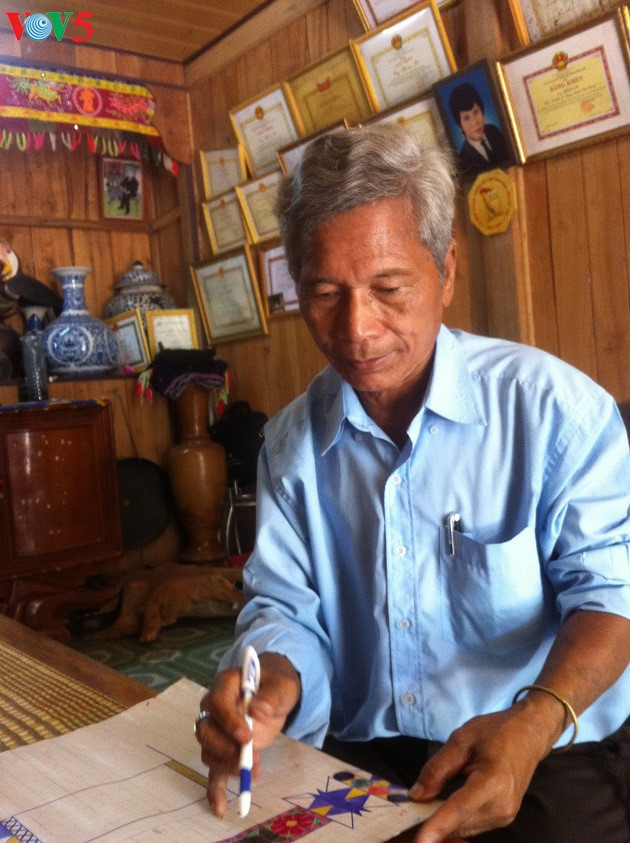 Village elder Bh’riu Po talks about his sketch of the Neu pole (Photo: Thu Hoa/ VOV5) |
