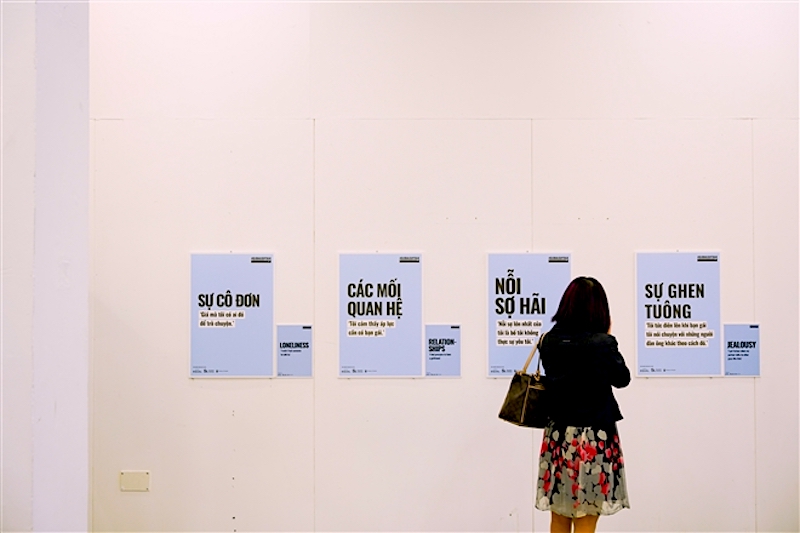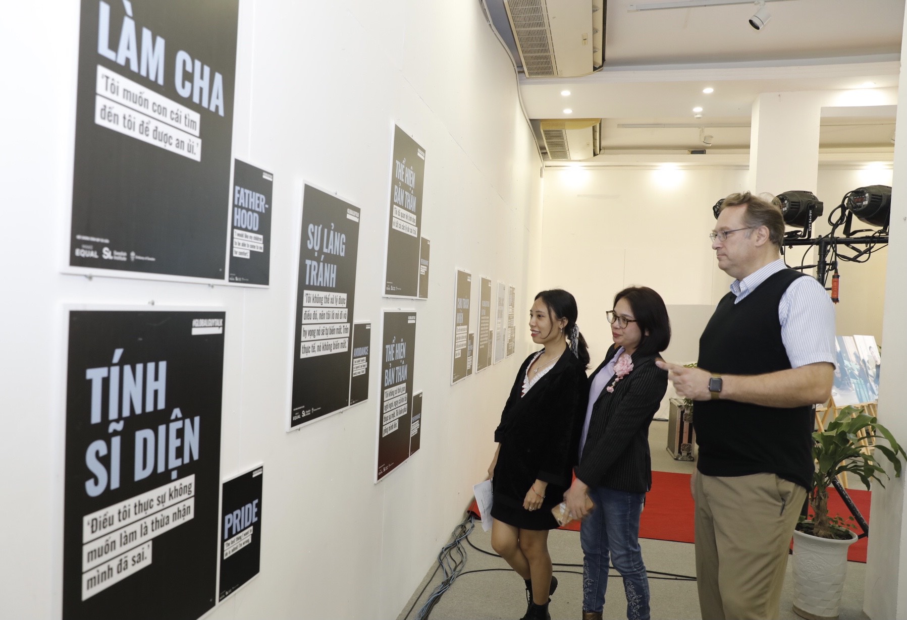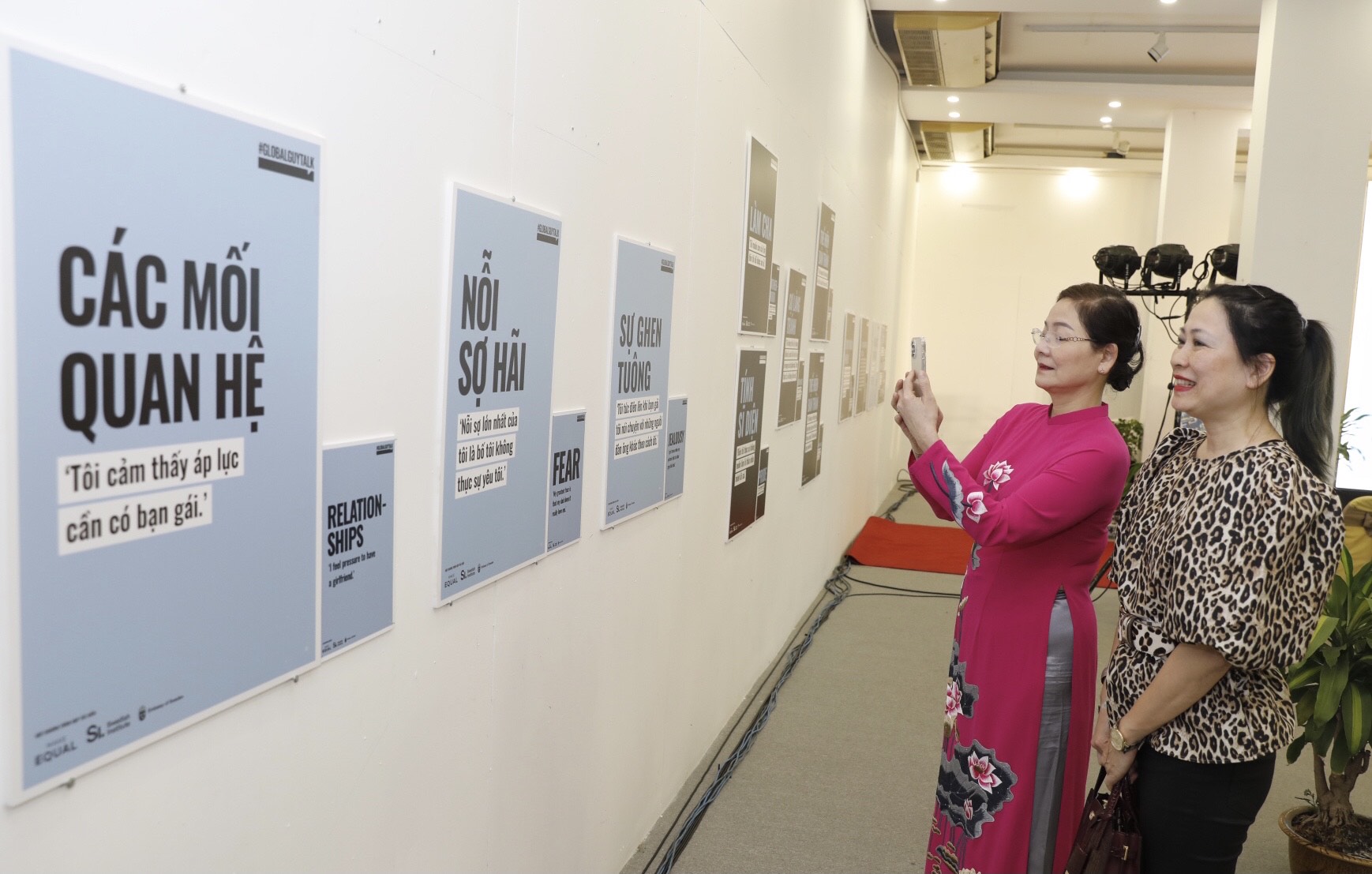 A woman visits the "GlobalGuyTalk" exhibition in Hanoi on 8 March 2021. (Photo credit: Swedish Embassy) |
