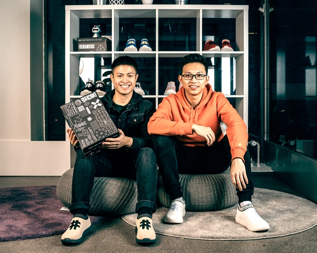 Tran Bao Khanh (L) and Chu Hoang Son, founders of Rens Original, which makes sports shoes from used coffee grounds. (Photo courtesy of Rens Original)