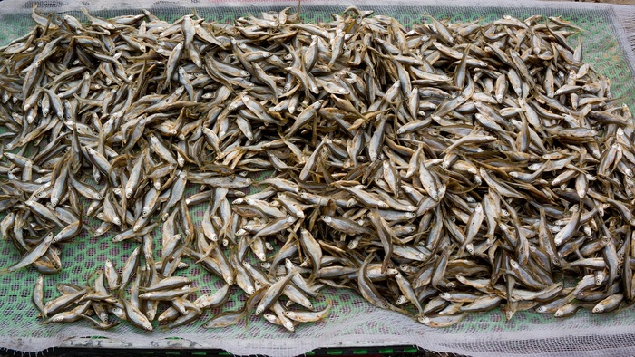 Small fish like fingers, caught in the lake and elaborately processed by the local people here, the rustic grilled fish has become a precious gift to attract visitors. (Photo: Trung Hung) |