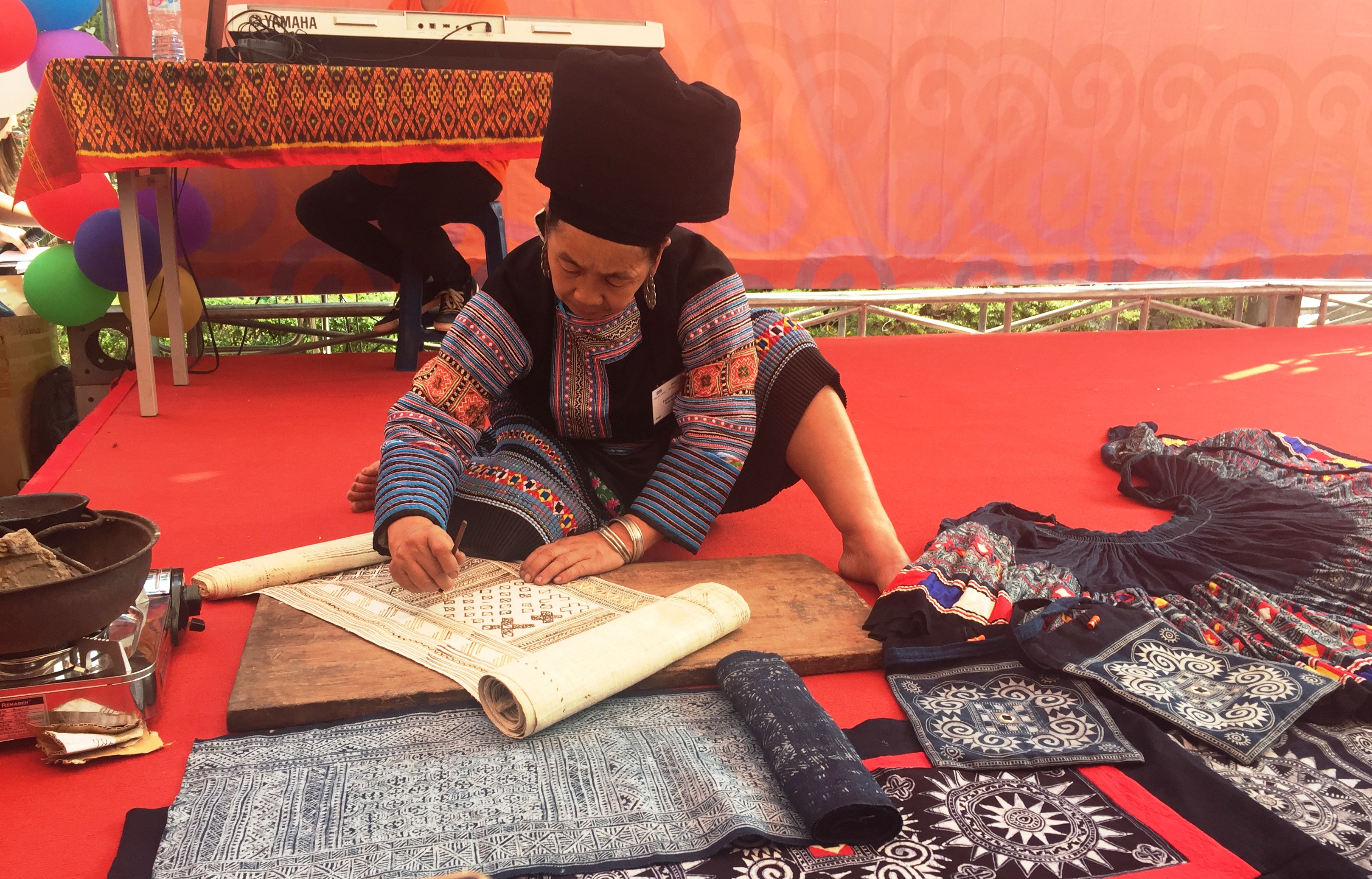 | An artisan of the White Mong ethnic group showed how to decorate dresses using the traditional hot bee wax (Photo: VOV/Dieu Ha) |