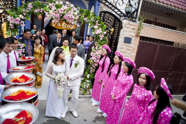 Nowadays, a few important rituals are performed at traditional weddings but many are very much simplified or virtually ignored. Dr. Tran Trong Duong regrets that Vietnamese people don’t fully preserve and protect their wedding traditions: “In modern life, Vietnam has lost many of its signature marriage practices. For example, in the past, when the bride arrived at the groom’s house, one person would use a pestle to hit a mortar because Vietnamese people considered pestle and mortar a symbol of prosperity and sexual intercourse. The mother-in-law had to hide prior to the bride’s arrival to prevent later disagreements. Today many rituals are ignored as not suitable for modern life. I think it makes marriage ceremonies less fun.”