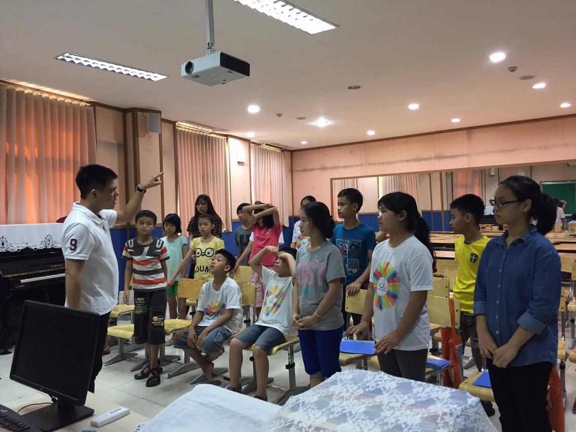 The choir class begins with vocal training. Around 20 students stand in 3 rows trying to mimic the sounds made by their teacher in order to improve their singing technique. Though those sounds are not familiar to Vietnamese, these children are still trying their best to take a deep breath, and from their stomachs, create high and echoic musical notes.