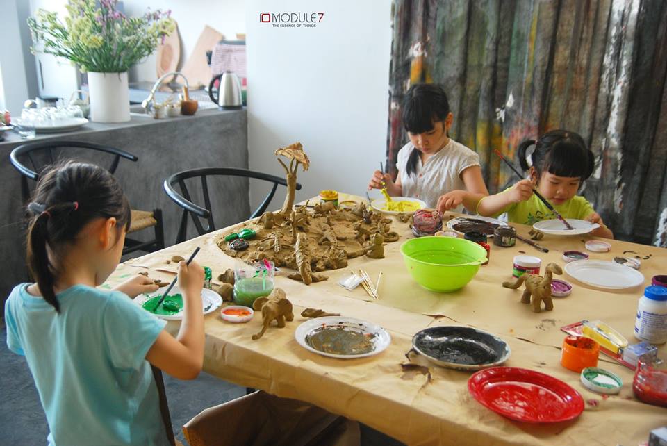 At Module 7 creative classes are held every Sunday. With the support of 2 or 3 artists, art lovers can feel free to experience new materials, develop and show their creative skills, express themselves, and stimulate their imaginations. The most exciting classes are the ones where parents learn new art techniques while watching their children play at making their own works of art. Minh Chau elaborates: “The creative learning classes here are flexible and suitable for adults and children alike. For example, at Module 7, adults have an opportunity to learn advanced techniques like glass painting, silk painting, wire jewelry making, and so on, while children can take up a new hobby of painting or making their own toys out of traditional materials. This is a new model, a new lifestyle.”