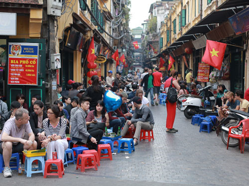 Hi, everyone. I’m standing in Ta Hien street in the heart of Hanoi’s Old Quarter. The street is just two hundred meters long, but it has everything: restaurants, cafes, and souvenir shops. There seems to be no sidewalk. That’s because of all the customers sitting on tiny stools around small tables in front of every house, drinking, chatting, and enjoying the boisterous street atmosphere.