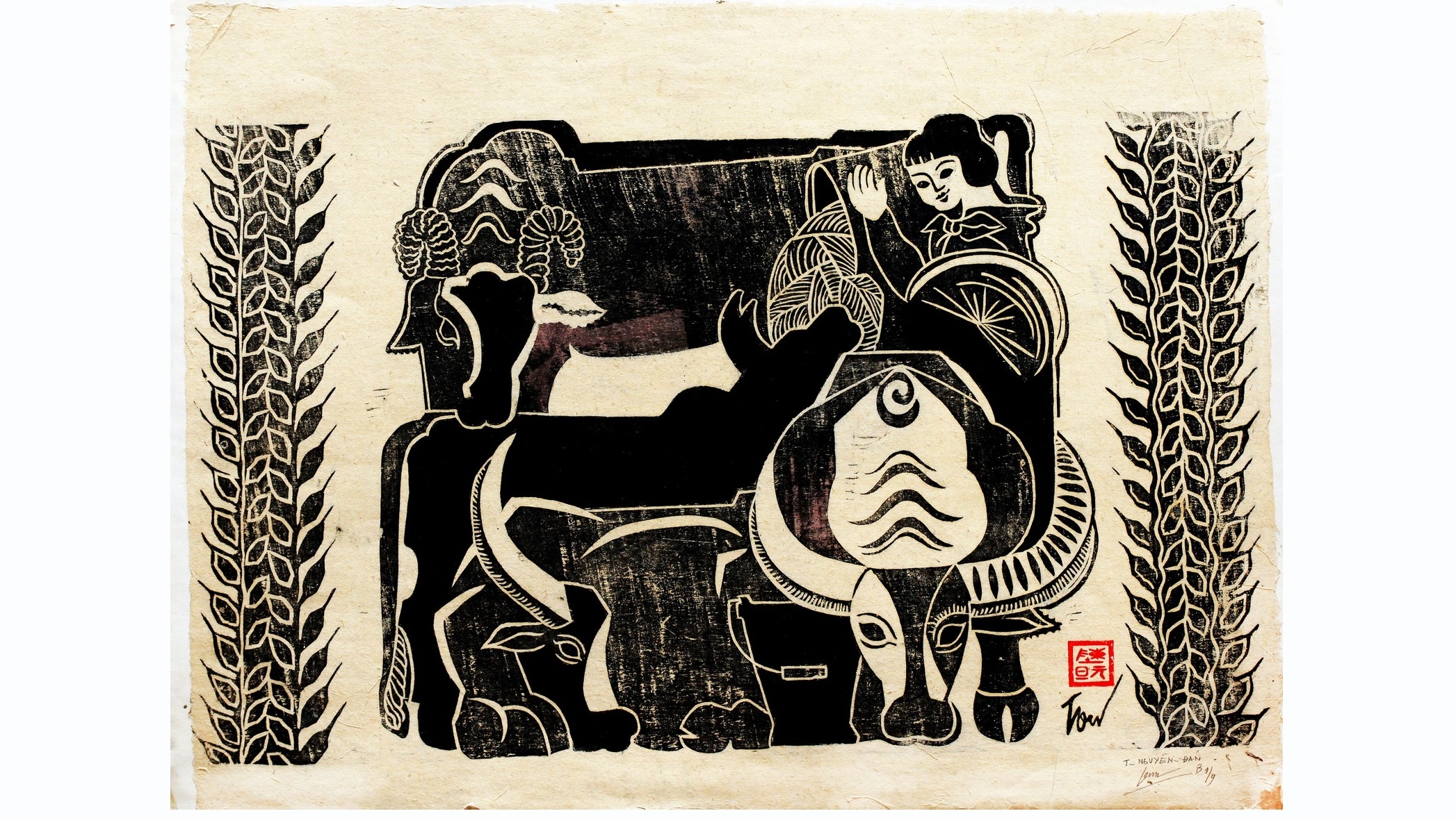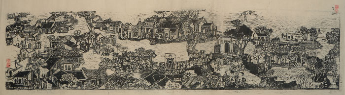 Tran Nguyen Dan’s artworks are renowned for depicting the beauty of Vietnam, its land and people in a simple, lyrical and soulful style. Through the half a century of many ups and downs in the country’s history, as well as the personal life of the artist, surprisingly all the paintings in this collection are all kept carefully as newly carved. The paintings illustrate the artist’s talent in using contrasting colors, complex layouts, intricate carvings and involves a successful combination of traditional and modern features. Talking about his artworks, Dan said: “For me, wood carving and painting is a way to express my feelings and my aesthetic concepts. I learned the quintessence of Dong Ho, Hang Trong, Sinh folk woodcut paintings and sometimes, the carving techniques of Western countries; afterwards I transferred them to my art. I apply the suitable techniques in each woodblock to showcase my personality. But, in fine arts, the most important thing is the feeling. Only when you love your homeland and look at the people around you with that love, will you successfully nail your artwork.”