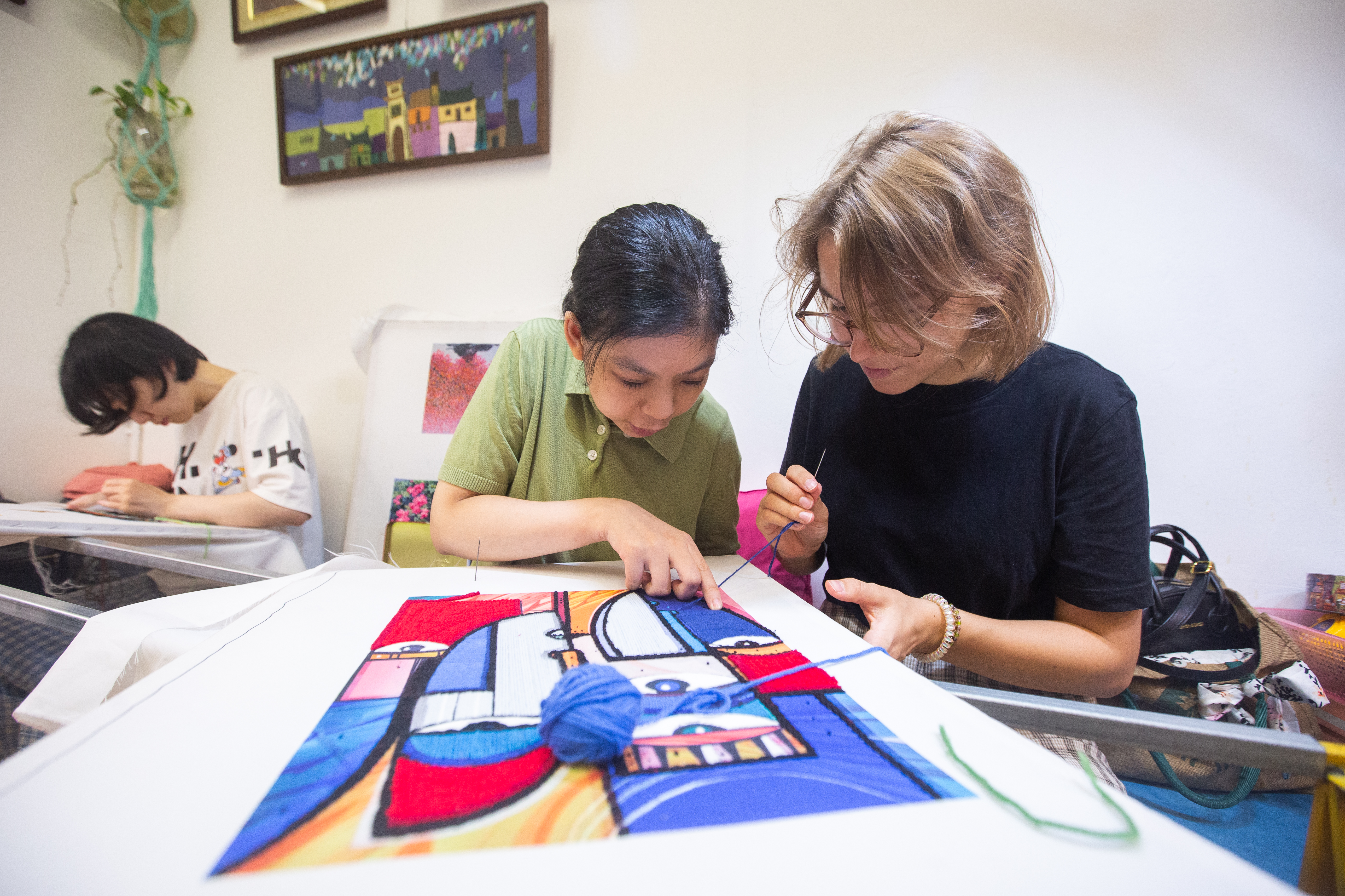 Artist Nguyen Thi Hong Van runs the studio — a combination of wool embroidery production and free vocational training for youth with a disability, autism, hearing impairment, or other difficult circumstance.