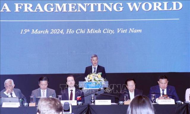 Ông Nguyễn Minh Vũ (giữa), Trợ lý Bộ trưởng Bộ Ngoại giao Việt Nam, phát biểu khai mạc Diễn đàn. Ảnh: TTXVN |