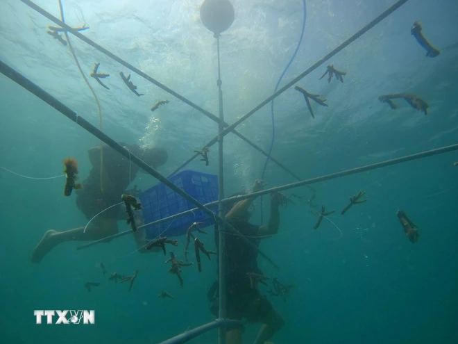 Cấy nhân giống nhánh san hô trên khung giá thể tại Khu bảo tồn biển Vườn quốc gia Núi Chúa (huyện Ninh Hải, tỉnh Ninh Thuận). Ảnh: TTXVN phát