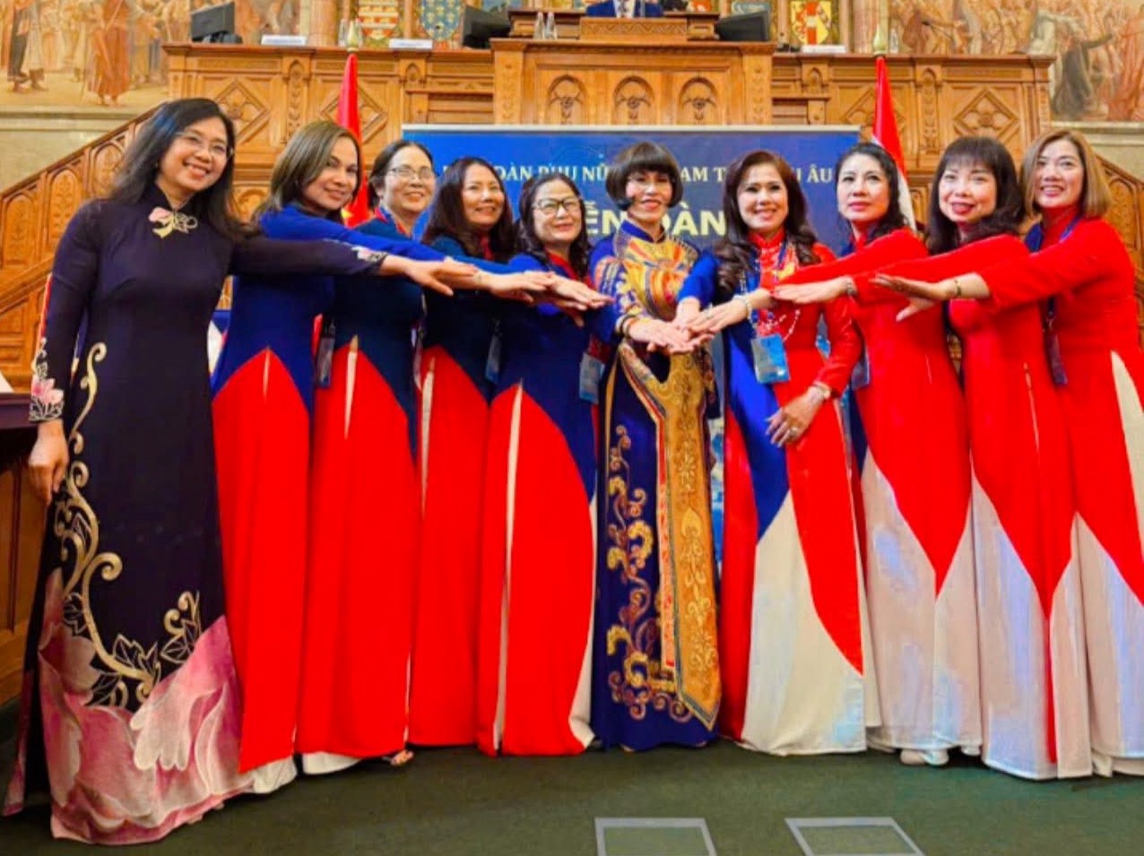 Các chị em chụp ảnh lưu niệm trong Diễn đàn Phụ nữ Việt Nam tại Châu Âu. |