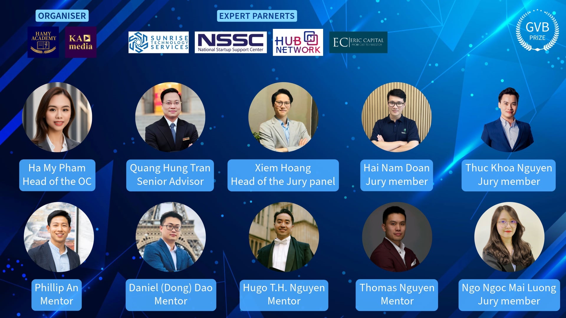 Cùng với đó: GVB Prize 2025 có sự tham gia của các mentor giàu kinh nghiệm trong nhiều lĩnh vực, từ công nghệ, tài chính, đến gọi vốn đầu tư. Các cố vấn không chỉ hướng dẫn đội thi về chiến lược phát triển mà còn giúp họ tiếp cận mạng lưới nhà đầu tư và doanh nghiệp quốc tế. Những mentors nổi bật như Phillip An – Đồng sáng lập Homebase, startup bất động sản công nghệ từng gọi vốn thành công 30 triệu USD. Hùng Nguyễn – chuyên gia tài chính, từng làm việc tại các công ty tài chính lớn, với kinh nghiệm sâu rộng về quản lý quỹ đầu tư và chiến lược kinh doanh. Tiến sĩ Daniel Dao - chuyên gia tài chính với chứng chỉ CFA, một trong những chứng chỉ uy tín hàng đầu thế giới về tư vấn tài chính và đầu tư. Nguyễn Quang- Giám đốc Sunrise Technology, một công ty công nghệ phát triển giải pháp số cho doanh nghiệp. Tất cả cùng mong muốn tìm kiếm những start-up có tiềm năng phát triển dài hạn, không chỉ có ý tưởng tốt mà còn có tính thực tiễn khả thi và phù hợp với xu hướng chuyển đổi Xanh và chuyển đổi số hiện nay. Và họ cũng muốn hỗ trợ thương mại hóa sản phẩm giúp các dự án khởi nghiệp không chỉ dừng lại ở ý tưởng mà có thể mở rộng quy mô và phát triển trên thị trường thực tế.