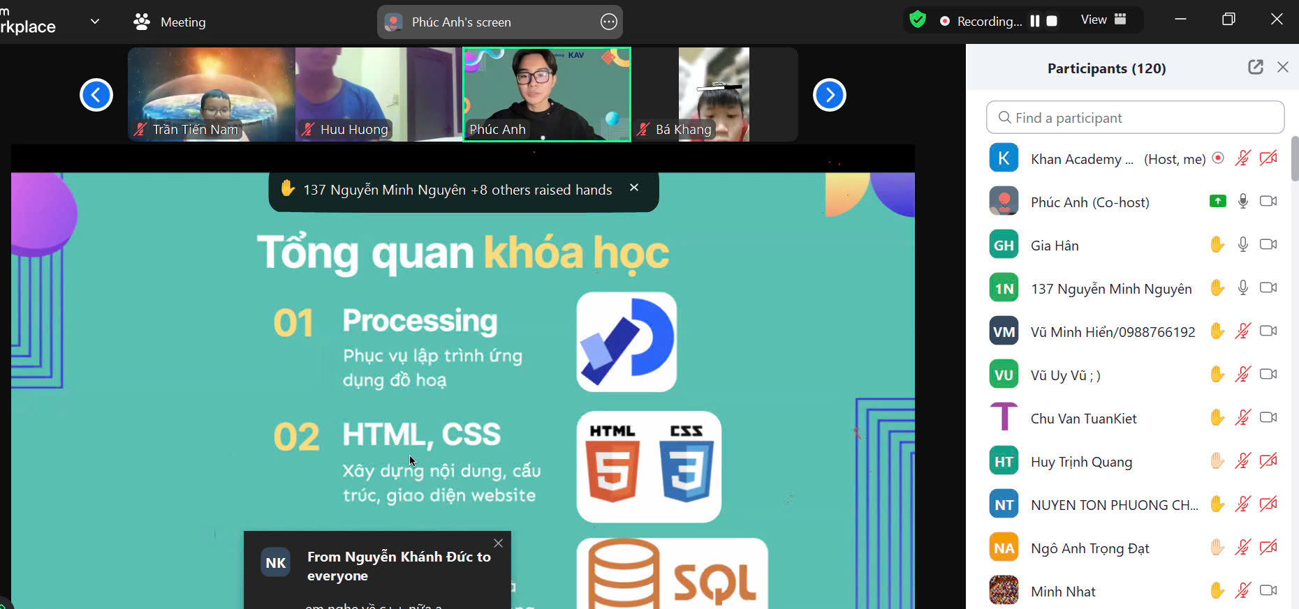 Cùng thời gian đấy, em cũng đã tổ chức các lớp học mở lập trình online với Khan Academy ở Việt Nam, để giúp các bạn học sinh trong nước có thể tiếp cận nhiều hơn với bộ môn lập trình. Mùa hè vừa rồi, em tổ chức lớp học mở về lập trình, lập trình 101 và lớp nâng cao kỹ năng số, là hai lớp chính. Qua đó, mong rằng em có thể giúp được các bạn nhỏ, đặc biệt là các bạn ở các tỉnh thành xa thành phố Hà Nội hay các tỉnh vùng sâu xa hơn có thể tiếp cận nhiều hơn với bộ môn lập trình.