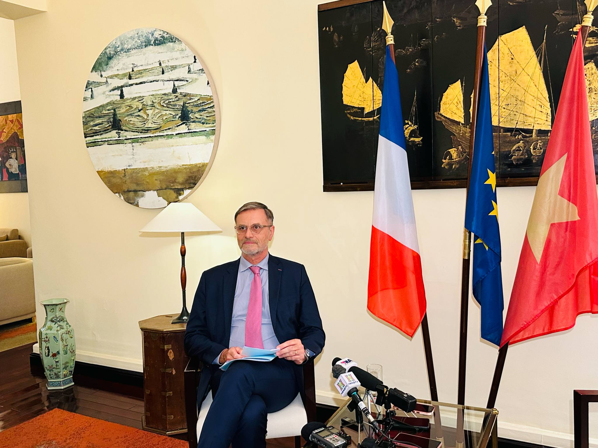 Đại sứ Olivier Brochet: Văn hóa tiếp tục là điểm nhấn trong quan hệ song phương, không chỉ quảng bá văn hóa Pháp tại Việt Nam mà còn góp phần phát triển các ngành công nghiệp văn hóa và sáng tạo tại Việt Nam. Trong suốt hai thập kỷ qua, Pháp đã đồng hành cùng thành phố Huế trong việc tổ chức Festival Huế, một trong những lễ hội văn hóa lớn nhất cả nước. Trong vài tháng tới, Photo Hanoi - lễ hội nhiếp ảnh quốc tế - cũng sẽ trở lại với lần tổ chức thứ hai, tiếp tục thể hiện sự gắn kết văn hóa giữa hai nước. Ngoài ra, chúng tôi cũng đang hỗ trợ Việt Nam trong việc phát triển các studio điện ảnh và hoạt hình. Mới đây, một thỏa thuận hợp tác đã được ký kết với trường Gobelins - cơ sở đào tạo hoạt hình hàng đầu thế giới - nhằm giúp Việt Nam nâng cao năng lực trong lĩnh vực này. Đồng thời, Pháp cũng hỗ trợ điện ảnh Việt Nam vươn ra thế giới, mà gần đây nhất là việc Việt Nam có gian hàng riêng tại Liên hoan phim Cannes năm nay - một bước tiến quan trọng để giới thiệu ngành điện ảnh Việt Nam với bạn bè quốc tế.