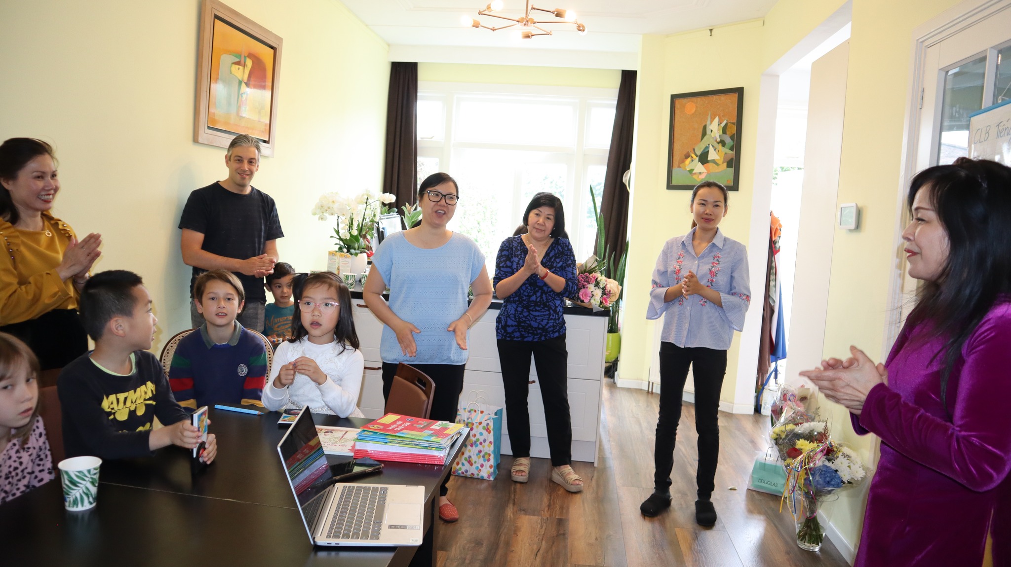 Rồi covid đến, lớp đóng cửa. Khi covid xảy ra, Đại sứ Hòa về nước, cũng dặn: bây giờ chị Hương ở đây, nên chị cố gắng giữ lớp tiếng Việt này và tìm người để giảng dạy, giữ gìn tiếng Việt.