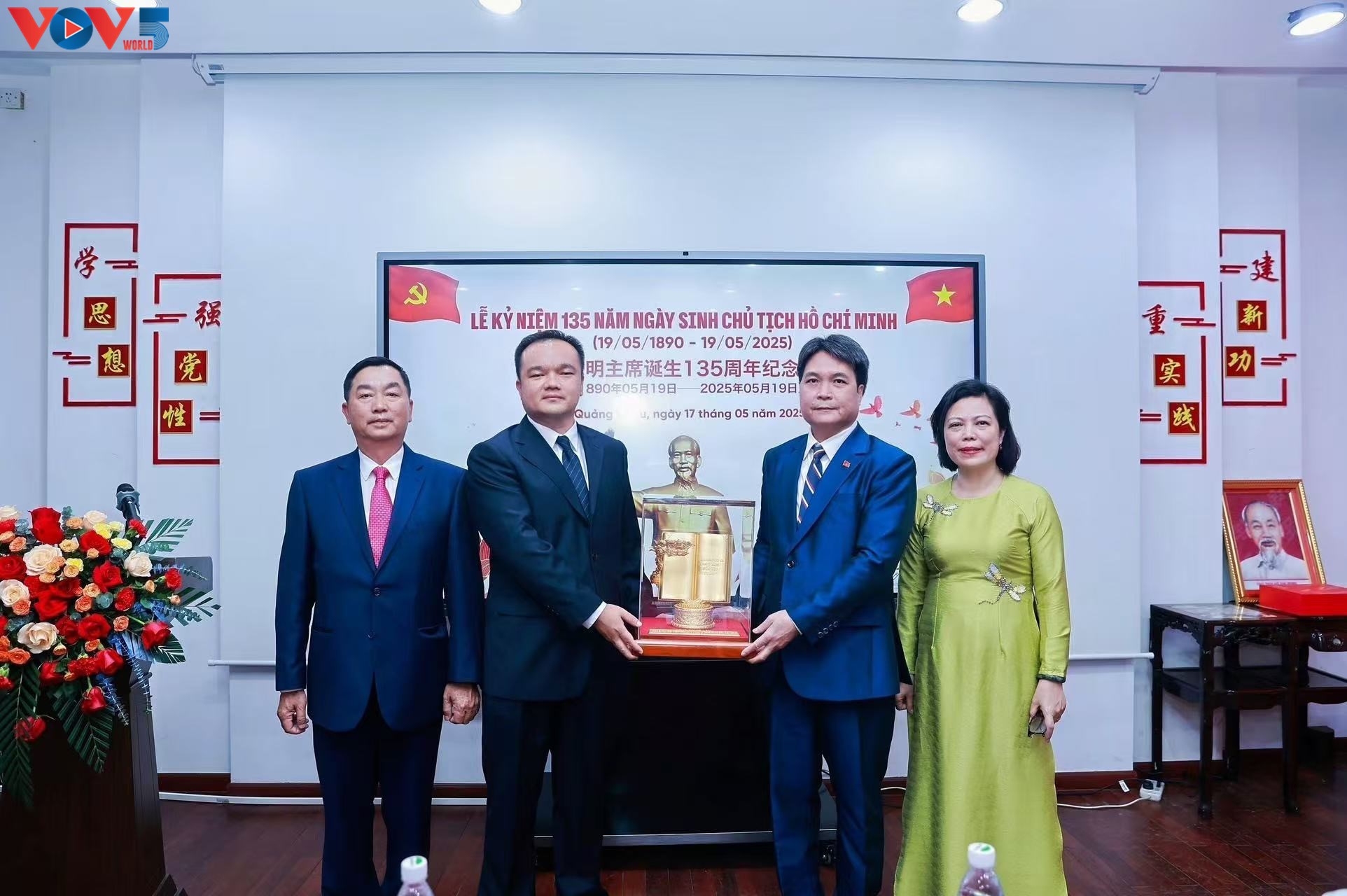 Tổng Lãnh sự Việt Nam tại Quảng Châu Nguyễn Việt Dũng (thứ hai từ phải sang) trao tặng phẩm của Tổng Bí thư Tô Lâm cho Giám đốc Bảo tàng Lịch sử Cách mạng Quảng Đông nhân kỷ niệm 135 năm ngày sinh của Chủ tịch Hồ Chí Minh.