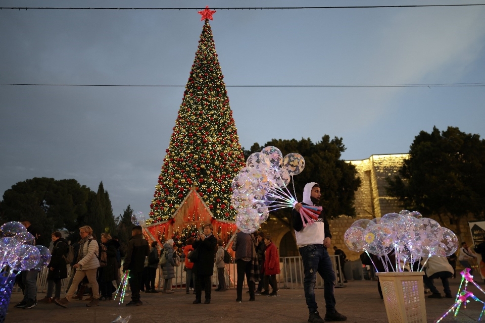 Một người đàn ông bán bóng bay được trang trí đèn nhấp nháy chuẩn bị cho lễ Giáng sinh ở Bethlehem, thuộc khu Bờ Tây do Israel chiếm đóng, ngày 23/12/2025. Ảnh: REUTERS/Ammar Awad |