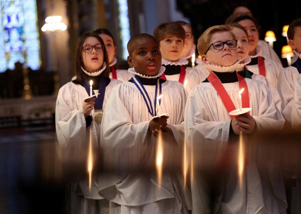 Ánh nến của niềm hy vọng về tương lai tốt đẹp hơn phản chiếu trên gương mặt các ca sĩ nhí trong dàn hợp xướng tại buổi diễn tập cho lễ Giáng sinh tại Nhà thờ St. Paul ở London, Anh, ngày 22/12/2025. Ảnh: REUTERS/Isabel Infantes |