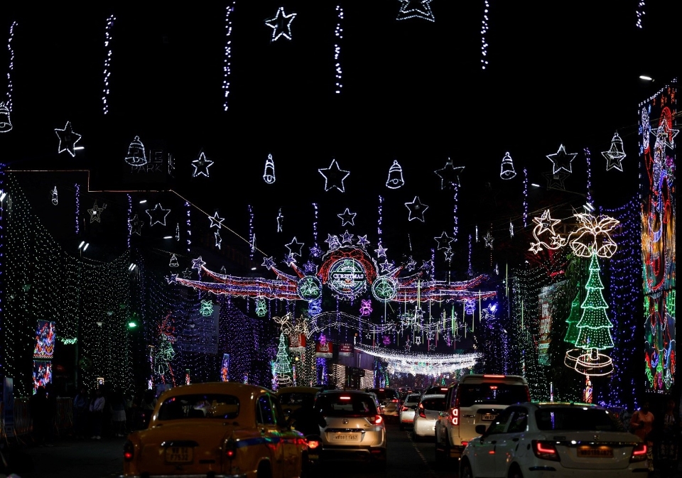 Giao thông tấp nập trên phố Park Street, được trang trí bằng đèn Giáng sinh, ở Kolkata, Ấn Độ, ngày 23/12/2025. Ảnh: REUTERS/Sahiba Chawdhary |
