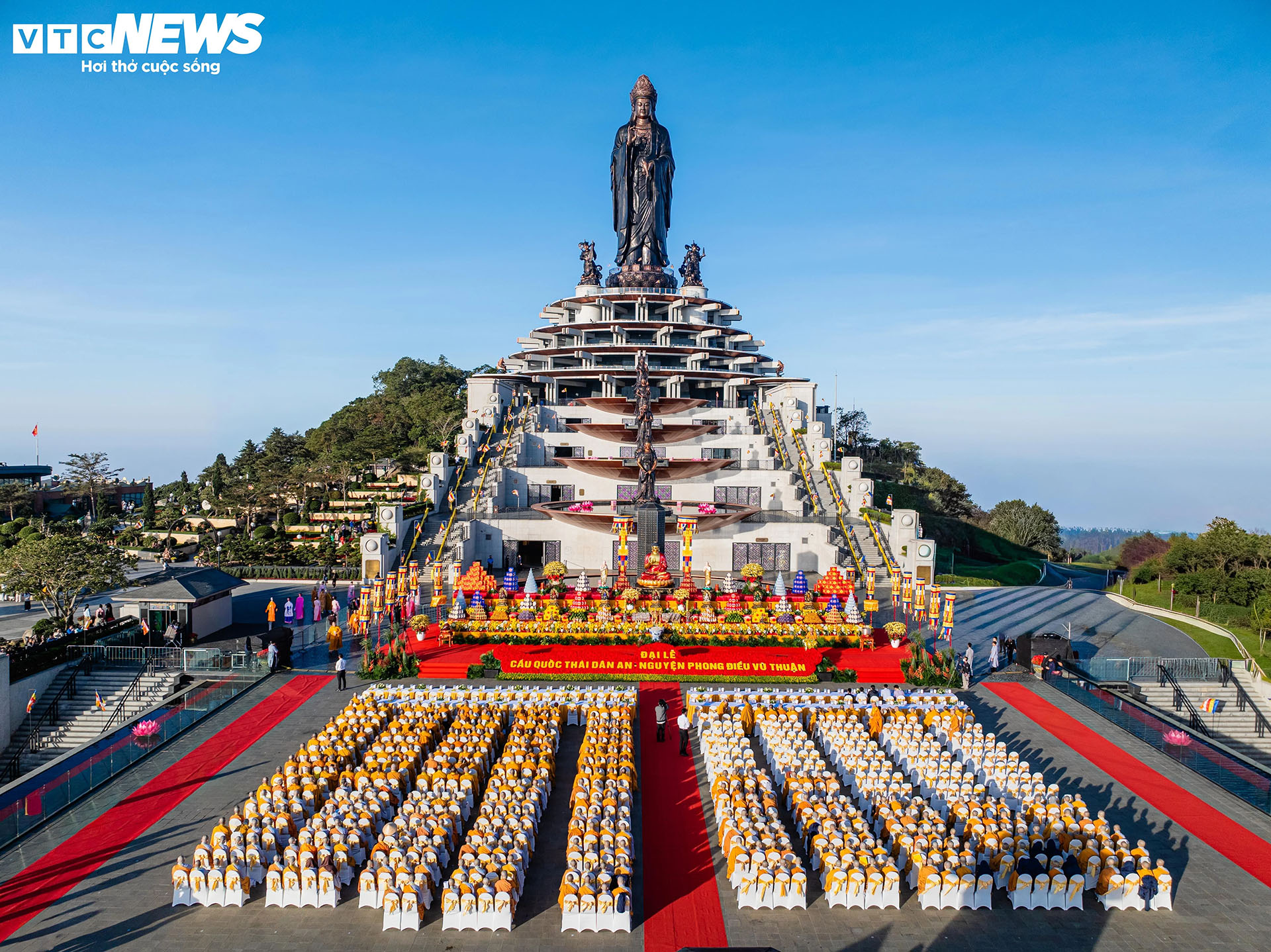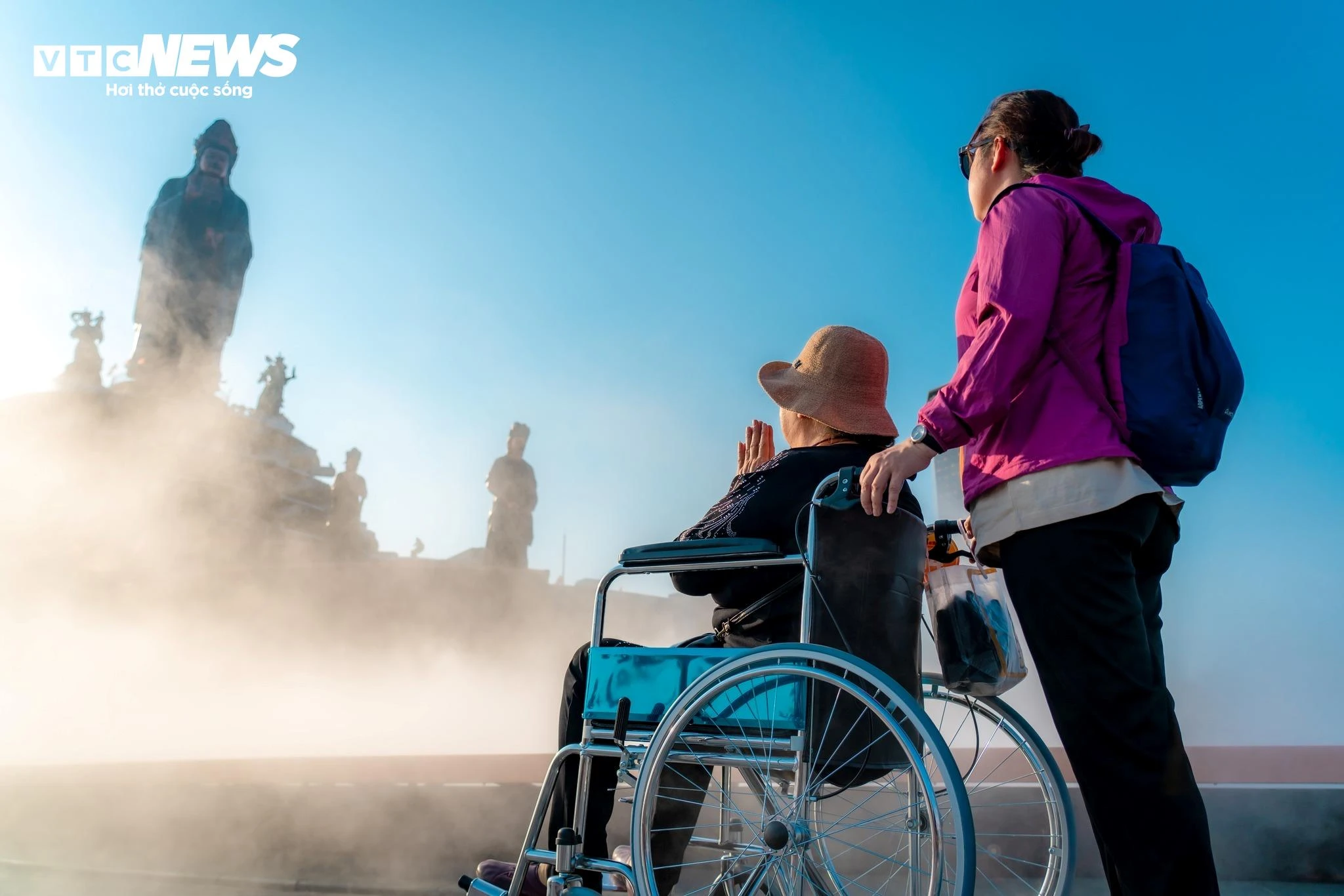 Dưới chân tượng Phật Bà là khu quảng trường rộng lớn, nơi thường diễn ra các nghi lễ tâm linh, cầu an, dâng đăng. Từ góc nhìn trên cao, con người hiện lên nhỏ bé giữa không gian thiêng và núi rừng bao la.