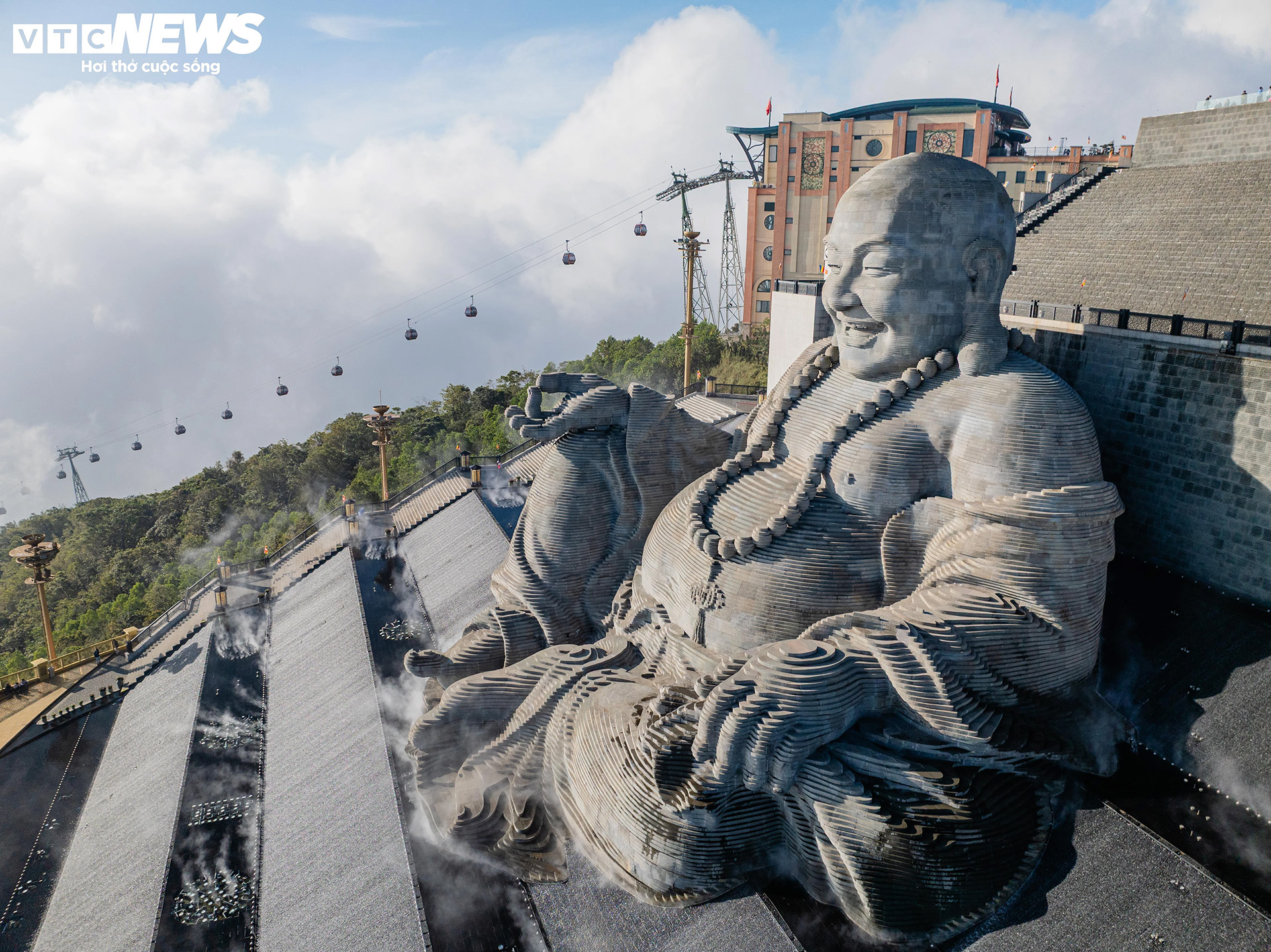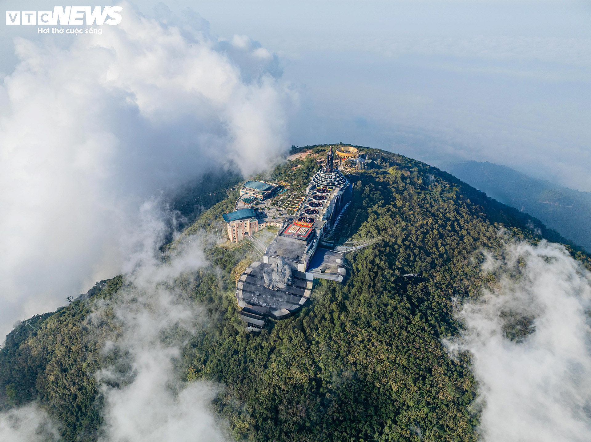 Từ trên cao, quần thể khu du lịch tâm linh trên đỉnh núi dần hiện ra giữa biển mây. Các công trình được bố trí trải rộng nhưng hài hòa với địa hình tự nhiên.