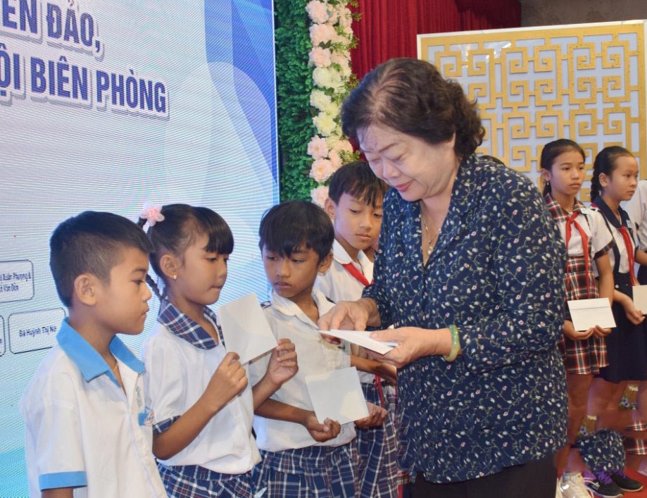 Bà Trương Mỹ Hoa - nguyên Bí thư Trung ương Đảng, nguyên Phó Chủ tịch nước, Chủ tịch Quỹ học bổng Vừ A Dính, Chủ nhiệm Câu lạc bộ “Vì Hoàng Sa - Trường Sa thân yêu” trao học bổng cho học sinh dân tộc tỉnh Bạc Liêu. Ảnh: Báo Bạc Liêu |