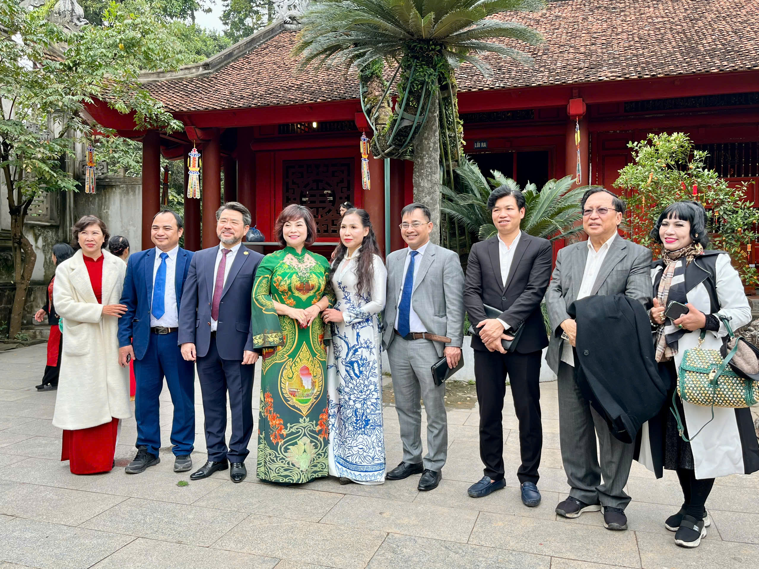 Các bà con kiều bào cùng lãnh đạo Khu Di tích lịch sử Quốc gia đặc biệt Đền Hùng chụp ảnh lưu niệm. |