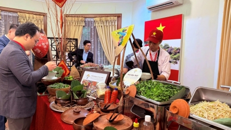 (VOV5) - Các đại biểu và khách mời quốc tế được thưởng thức ẩm thực Việt qua các món ăn đặc trưng ngày Tết như bánh chưng, giò, chả, nem rán.