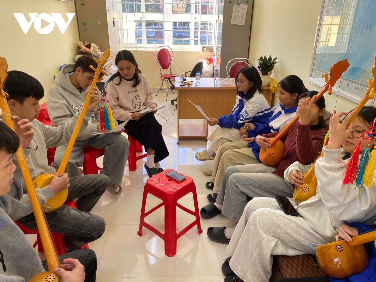 Các em học sinh trường THPT Thạch An, tỉnh Cao Bằng, cùng nhau luyện tập cách phát âm tiếng Tày và hát then, đàn tính sau mỗi buổi học chiều. Ảnh: Nông Diệp/VOV-Đông Bắc