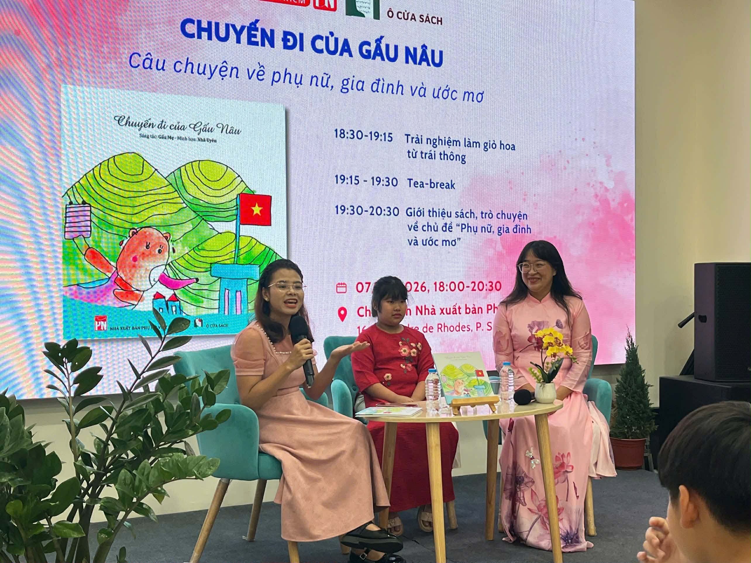 Tối 7/3, tại Chi nhánh Nhà xuất bản Phụ nữ Việt Nam ở TP.HCM, buổi trò chuyện giới thiệu sách “Chuyến đi của Gấu Nâu” với chủ đề “Phụ nữ, gia đình và ước mơ” diễn ra trong bầu không khí đầy cảm xúc, với sự hiện diện của tác giả Thanh Tâm cùng đông đảo bạn đọc gồm cả phụ huynh và các con.