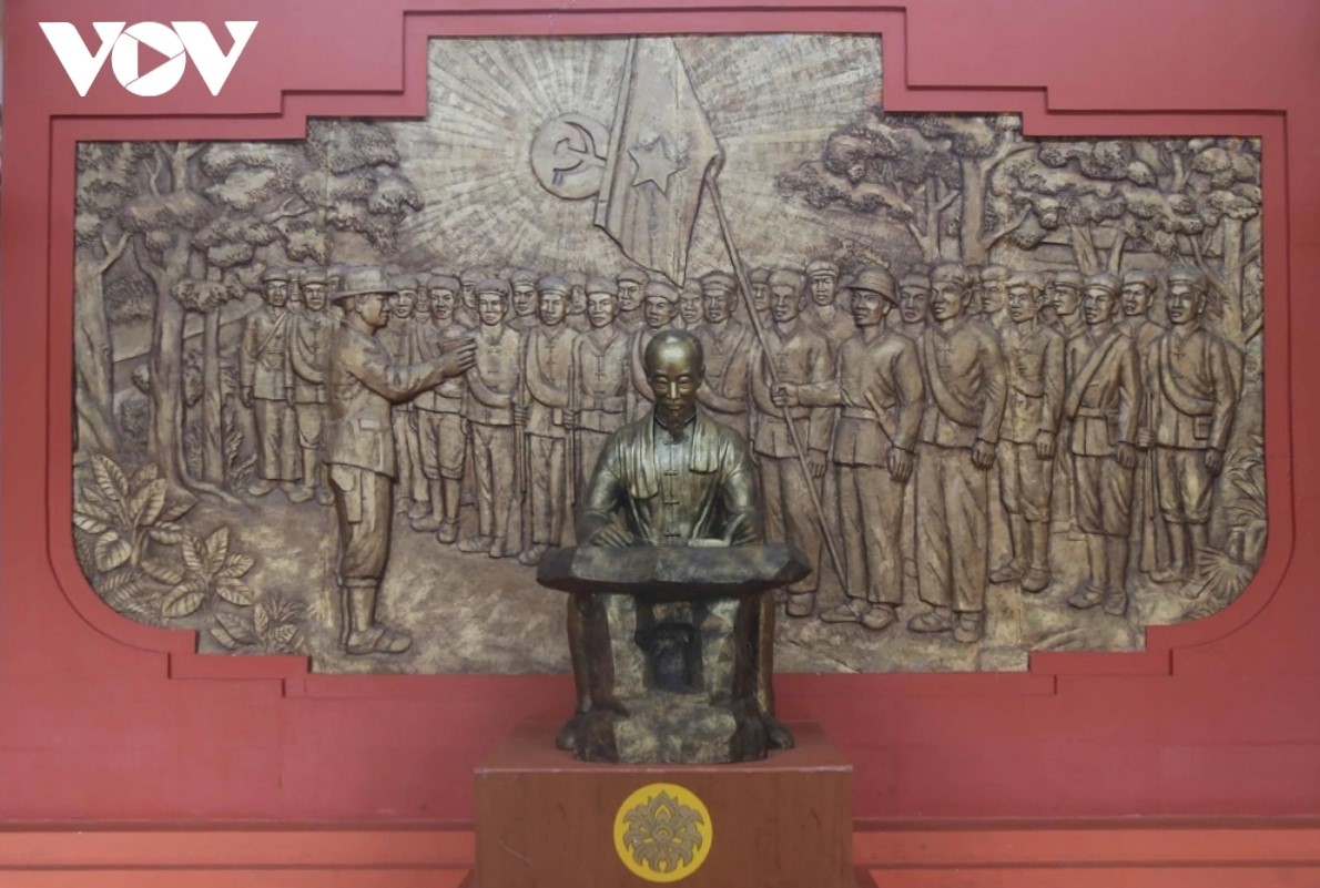 Bức phù điêu Lễ thành lập Đội Việt Nam Tuyên truyền giải phóng quân tại di tích Quốc gia rừng Trần Hưng Đạo - Ảnh: VOV |