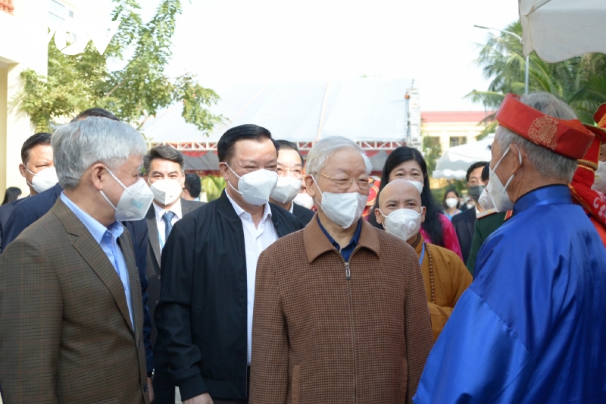 Tổng Bí thư Nguyễn Phú Trọng dự Ngày hội đại đoàn kết toàn dân tộc tại nhà văn hoá thôn 5, xã Yên Sở, huyện Hoài Đức. Ảnh: VOV |