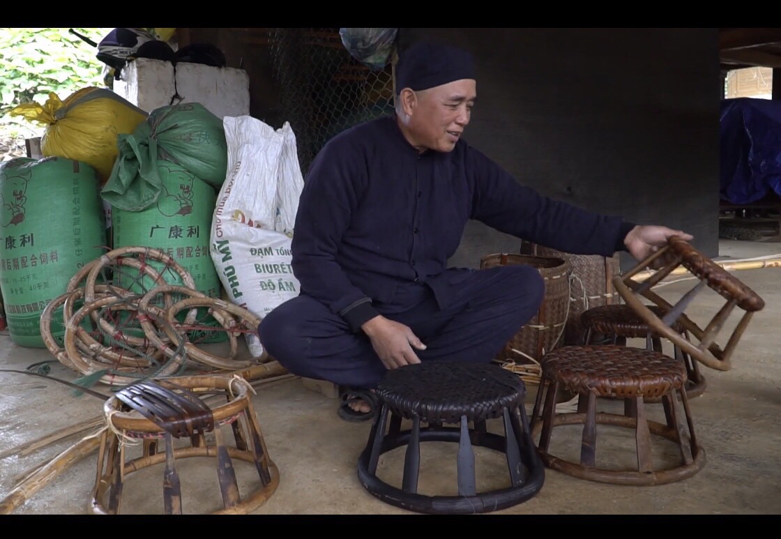 Nghệ nhân Vì Văn Chữ chia sẻ: "Để làm chiếc ghế mây, mình đi vào rừng, lấy cây mây về làm lạt, lấy 1 nửa dây mây, dây ngọn, làm lạt để đan, một nửa dưới chia đôi làm vòng tròn của ghế. Một vòng to và 1 vòng nhỏ, lạt thì cần phải phơi khô rồi đun, nó dẻo thì mình mới đan được. Vòng khi nào khô thì mình đo, song mình cắt. Sau đó cho trống vào giữa, trống phải là tre già để đảm bảo chắc chắn. Sau đó mình đan là hoàn chỉnh luôn."