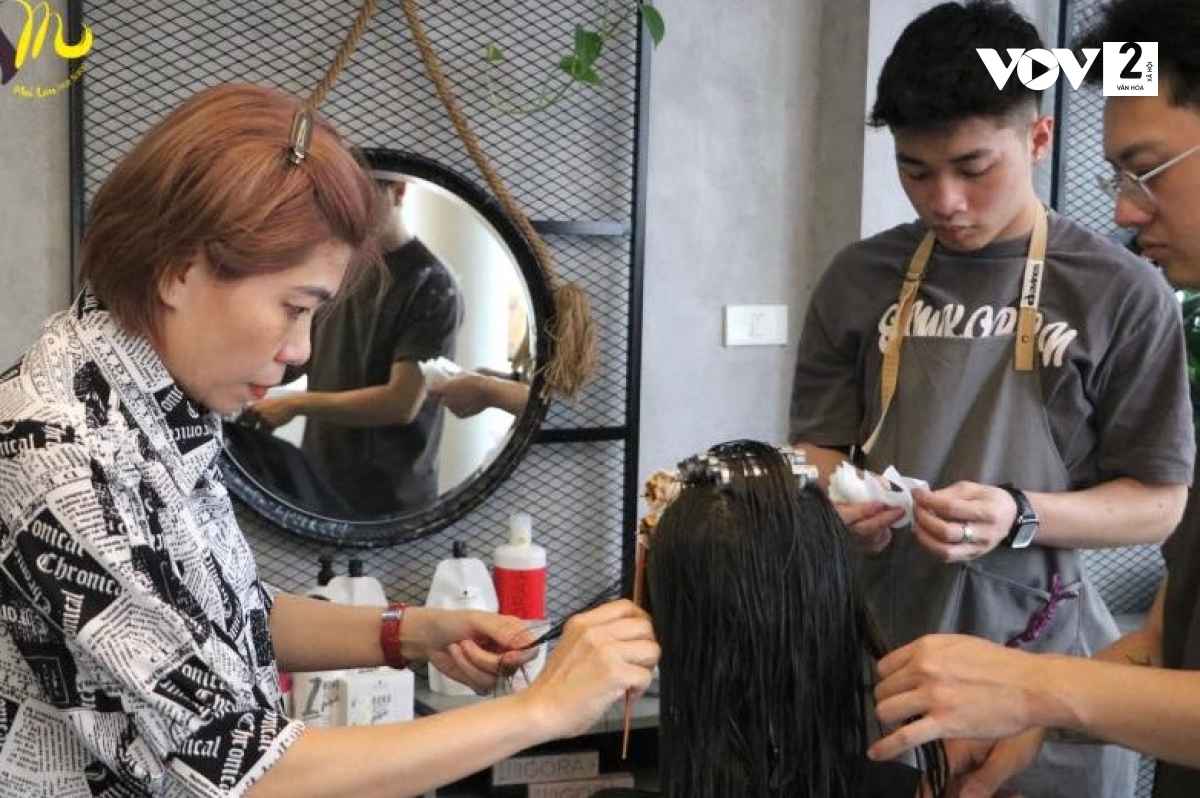 Chị Mai Lan (áo trắng) cùng chuyên gia về tóc hướng dẫn cho các học viên học nghề tại Salon Mai Lan - Ảnh: VOV
